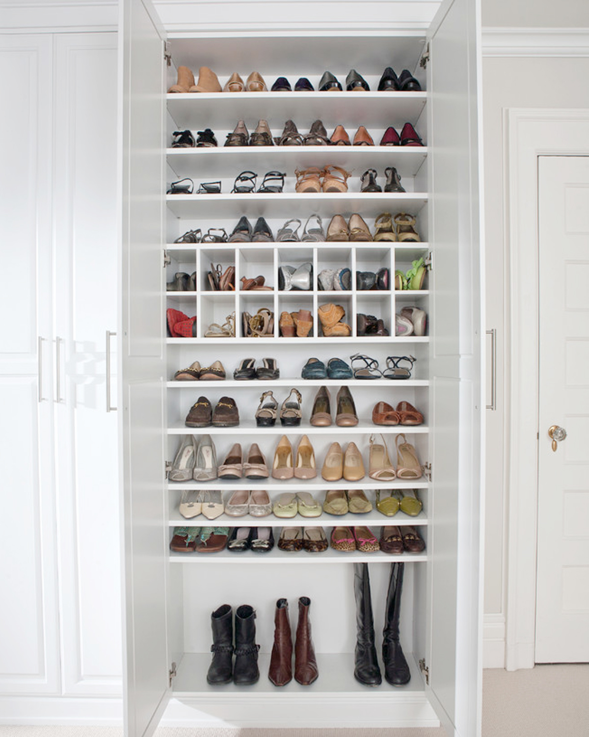 定製鞋櫃的內部空間應合理佈置。層壓的高度可以根據鞋子的不同而設計。例如,平面鞋板設定為8-10cm,16個高跟鞋層板設定為cm,靴層板設定為50cm高,活動層板也可以安裝在鞋櫃層板上,以便以後調整。