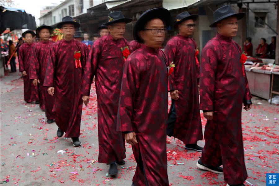 穿著綾羅綢緞長袍馬褂,戴著禮帽的是村裡的“鄉紳”,也是村裡最受尊重的老人。營老爺活動是由村裡德高望重的主事老大”(長者)組織,他們透過擲“聖盃”(徵求神明意見的工具)來確定營老爺“活動的吉日和吉時,然後募得經費,貼出公示,安排出遊的程式及人員,再訓練村裡的鑼鼓隊等等。