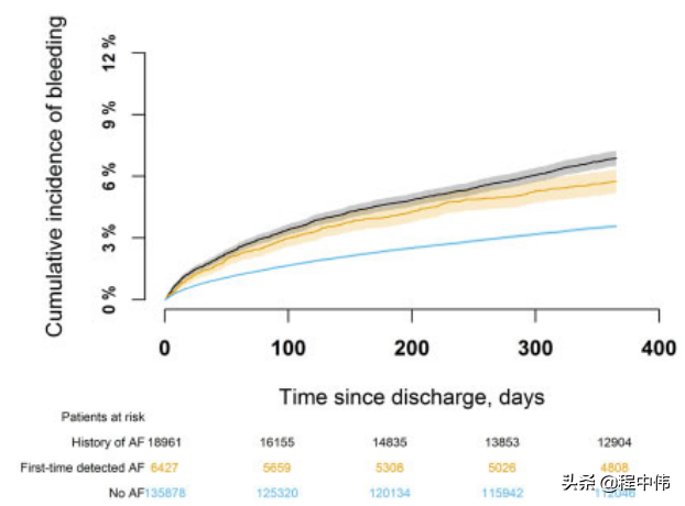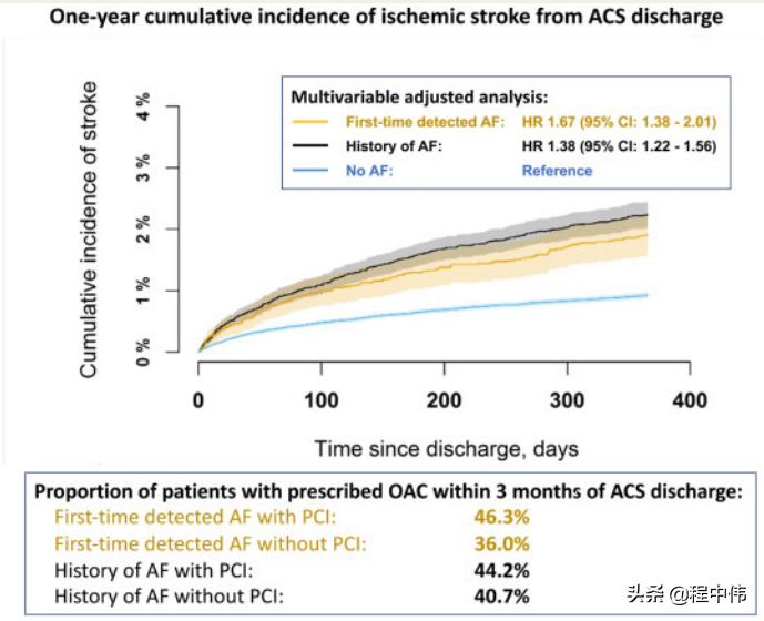 共161,266例ACS倖存者:135,878例(84.2%)既往無AF;18,961例(11.8%)既往AF病史;6427例(4%)首次診斷AF。與既往沒有AF者比較,校正1年事件發生率分別為:缺血性中風在AF史和首次診斷AF者分別HR 1.38 (95% CI 1.22–1.56)、HR 1.67 (95% CI 1.38–2.01);死亡在AF史和首次診斷AF者分別HR 1.25 (95% CI 1.21–1.31)、1.52 (95% CI 1.43–1.62);出血在AF史和首次診斷AF者分別HR 1.22 (95% CI 1.14–1.30)、1.28 (95% CI 1.15–1.43)。