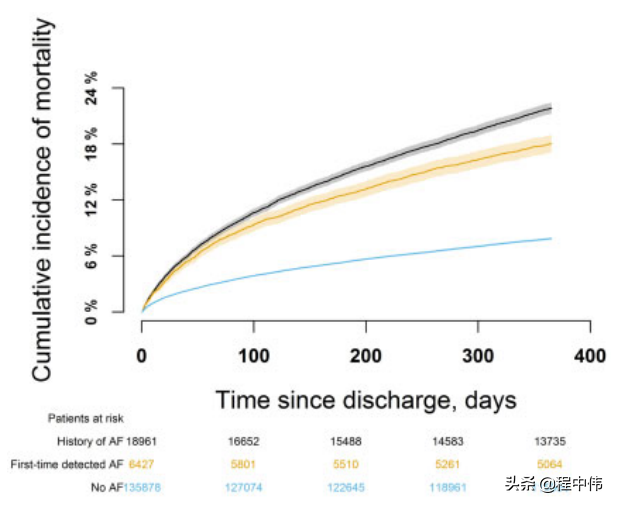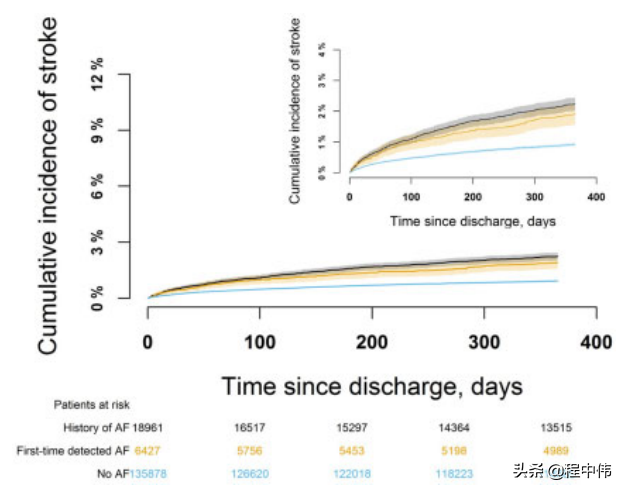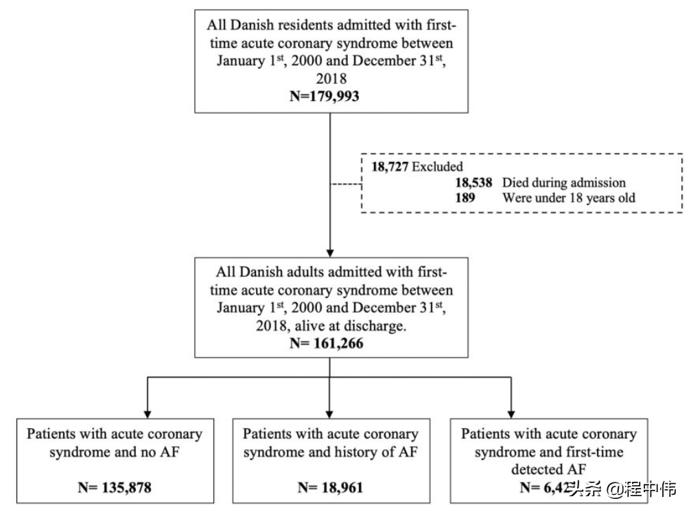 這是使用丹麥全國註冊資料庫資料(2000至2018年),研究急性冠脈綜合徵(ACS)合併首次診斷房顫(AF)患者在現代治療手段情況下1年預後情況。分為三組:1組,ACS期間和之前沒有AF;2組,既往AF病史;3組,ACS期間首次診斷AF。使用多因素校正Cox百分比危險分析方法比較3組在1年隨訪期間,缺血性中風、死亡和出血事件發生率。