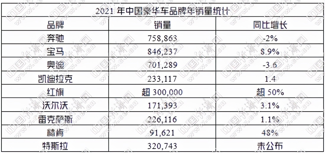 傳統豪華品牌之外,特斯拉、紅旗等品牌也異軍突起,成績亮眼;特別是造車新勢力借勢新能源浪潮,強勢地衝擊著豪華車市場。2021年,特斯拉累計銷量達32萬輛,“殺入“二線豪華的頭部陣營。