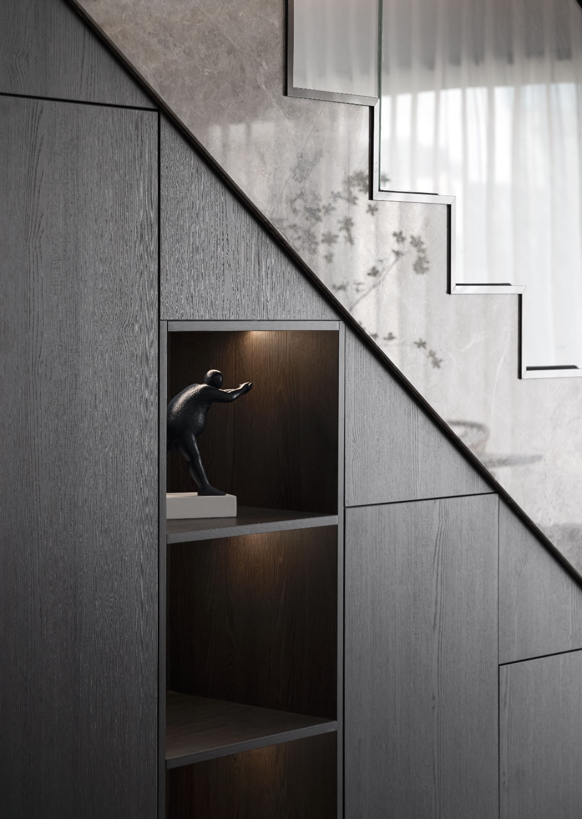 作為一層Loft,樓梯口下方的空間,也被完美利用,打造成了一個家政儲物區,像是家裡的一些日常清潔工具,都可以收納在這個區域。