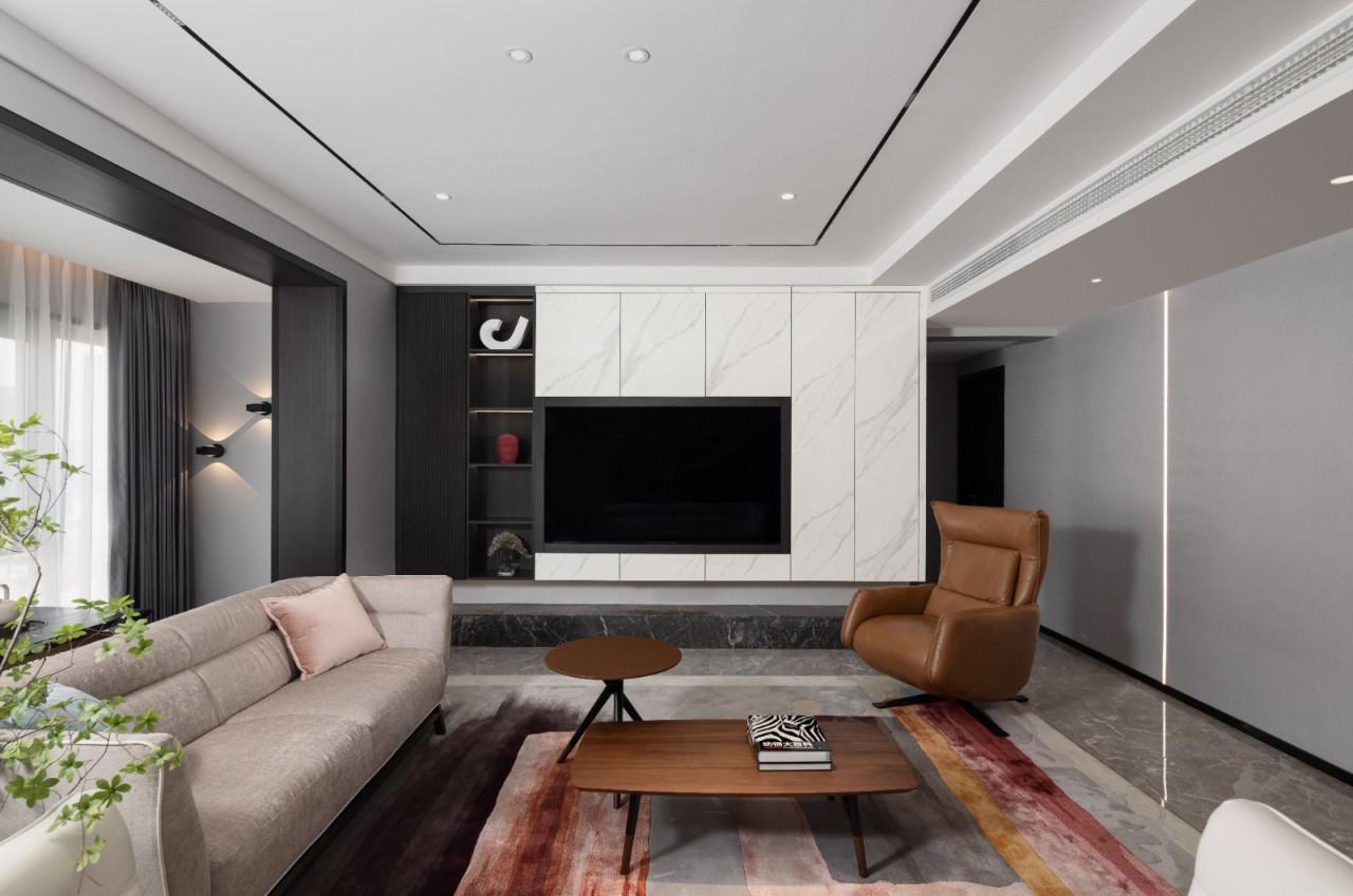 客廳的吊頂顯得簡約又雅緻,少了繁瑣的吊燈修飾,僅以燈帶+射燈來採光,迎來了落落大方的空間感。