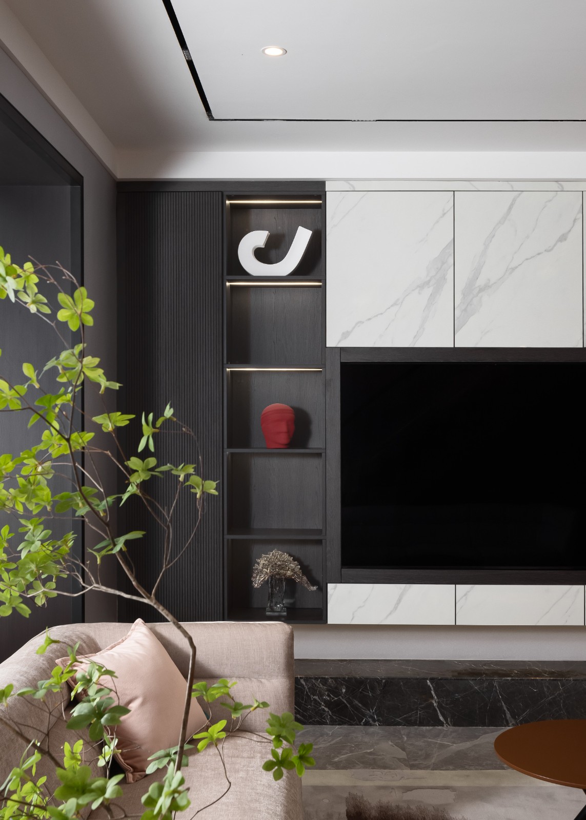 同時儲物式的電視牆,也是一個值得一提的設計,可以收納客廳裡的日常用品,讓空間更顯整潔有序之美。