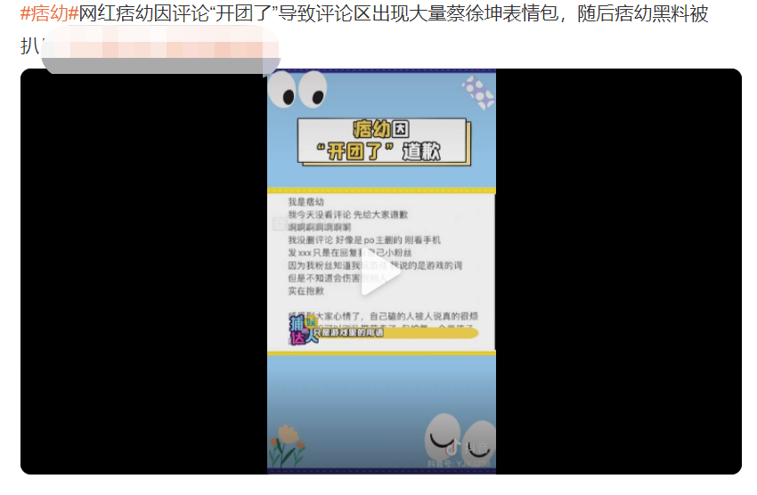 當痞幼的評論區充斥起大量黑圖之後,蔡徐坤的粉絲也坐不住了,她們又對痞幼進行了新一輪輿論施壓。最後,痞幼選擇在網路上進行道歉,並表示自己發這三個字並沒有侮辱蔡徐坤的意思,完全是驢唇不對馬嘴。