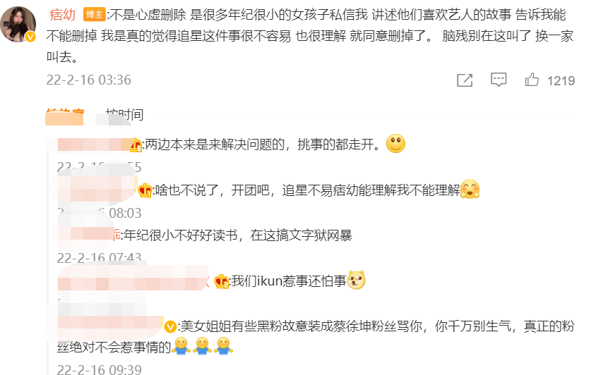 蔡徐坤的粉絲面對她的道歉,也表示了理解,說她們這些天時間確實比較敏感,因為黑粉太多,已經被黑得有點怕了,所以不想讓蔡徐坤再受到傷害了。
