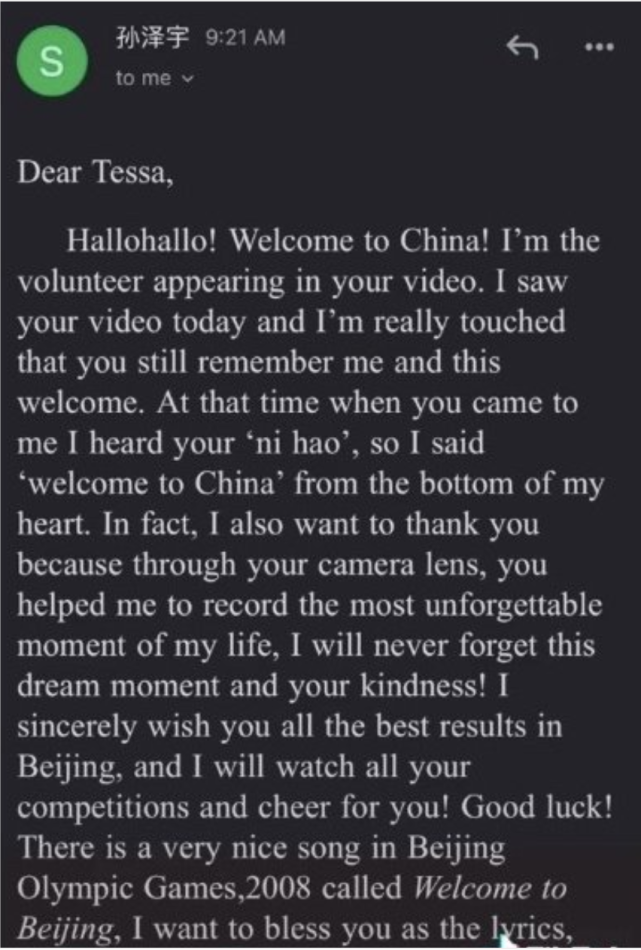 孫澤宇感謝特莎幫自己記錄下了人生最難忘的時刻,祝願她和所有運動員像2008年奧運會《北京歡迎你》唱的那樣“在黃土地重新整理成績”。
