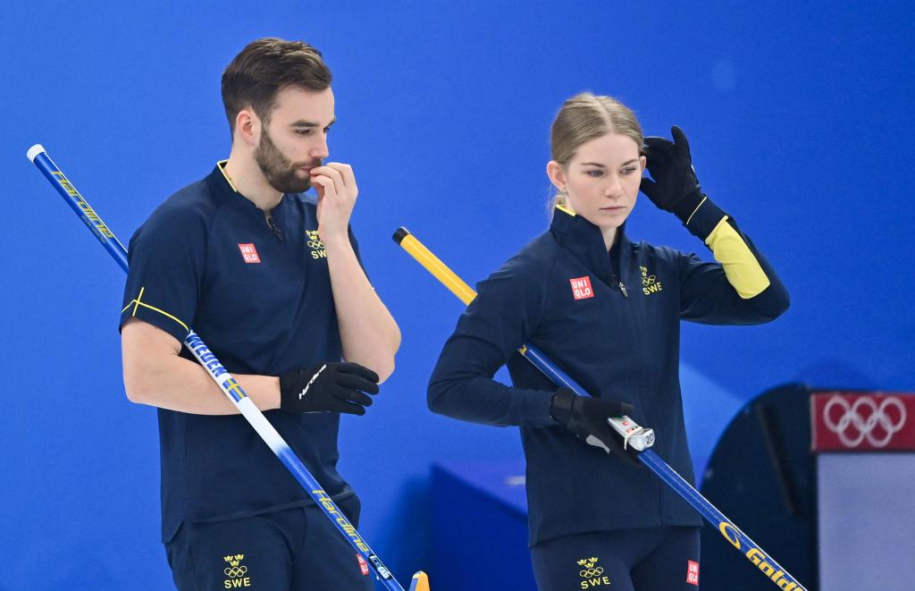 2月8日,瑞典隊選手奧斯卡·埃裡克松(左)和阿爾米達·德瓦爾在北京冬奧會冰壺混雙銅牌賽中。新華社記者黃孝邦攝