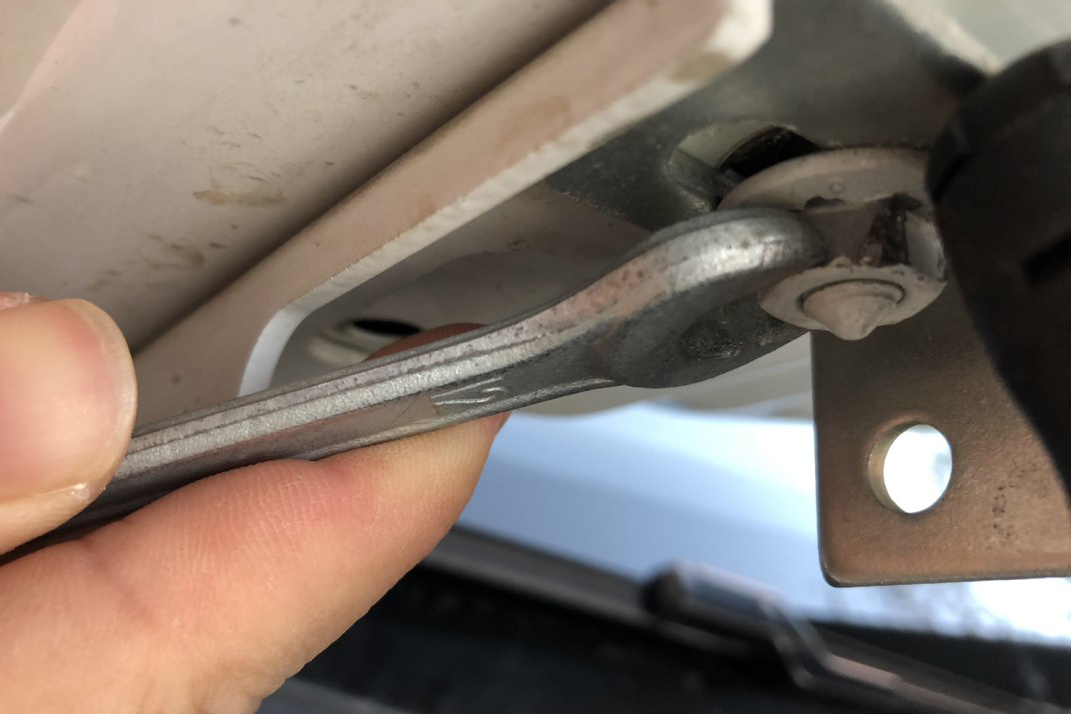 第三步,安裝新的液壓支撐杆。首先安裝液壓桿的下端固定螺絲,下面的螺絲就轉心螺絲,直接裝配到拆卸後預留了螺絲孔位上就行,緊固到位即可。之後,將液壓桿上面的螺絲孔位跟剛剛裝好的支架進行連線,這個需要從側面用螺絲進行緊固。兩側的安裝操作一致,裝配到位即完成改裝。