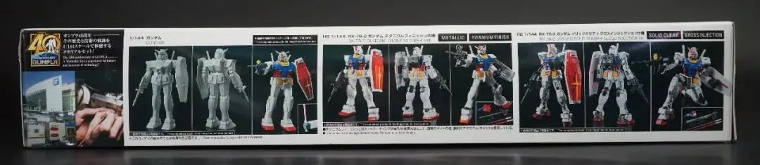 1/144比例的元祖高達可以說是萬代塑膠拼裝高達的開始,也是40餘年發展史上的一座座道標。2020年8月,萬代選取了3款最具紀念意義的1/144元祖,發售了鋼普拉40週年套裝,售價5000日元,據說在廣州展會賣到470人民幣。作為紀念品,這款產品的設計可圈可點。選材上,包含了被稱為萬膠之祖的第一款的1980版塑膠拼裝元祖,和20年後可動分色都有了明顯提升的HGUC021,以及黑科技大成的最精細小比例高祖——RG。並且,HGUC021採用了釉面質感的特殊塗層,RG元祖包含了部分透明件,素組效果都較之通販有了明顯提升,至少是更閃亮了。