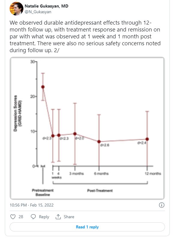 “三分之一的參與者在隨訪過程中的某個時候開始使用抗抑鬱藥治療,大約42%的人在這段時間內接受了研究之外的某種形式的心理治療,”Gukasyan在Twitter上報告說。“總的來說,令人鼓舞的是,透過12個月的隨訪,緩解和治療反應仍然很高,但對一些參與者來說,這種持續的改善的一部分可能也是由其他形式的治療驅動的。”