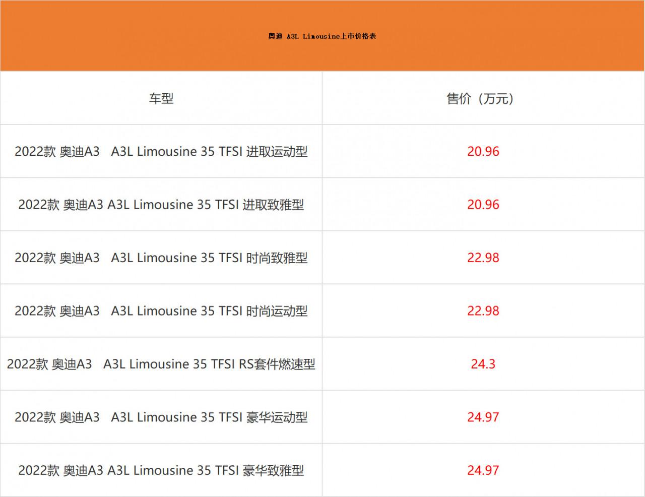日前,我們從奧迪官網獲悉,2022款奧迪A3已經上市,新車依舊推出A3 Sportback兩廂版和A3L Limousine三廂版車型,售價區間為20.31-24.97萬元。作為年度小改款車型,新車僅針對外觀進行了一定調整,增加了18英寸輪圈可選,還首次引入了RS套件燃速型限量版車型。