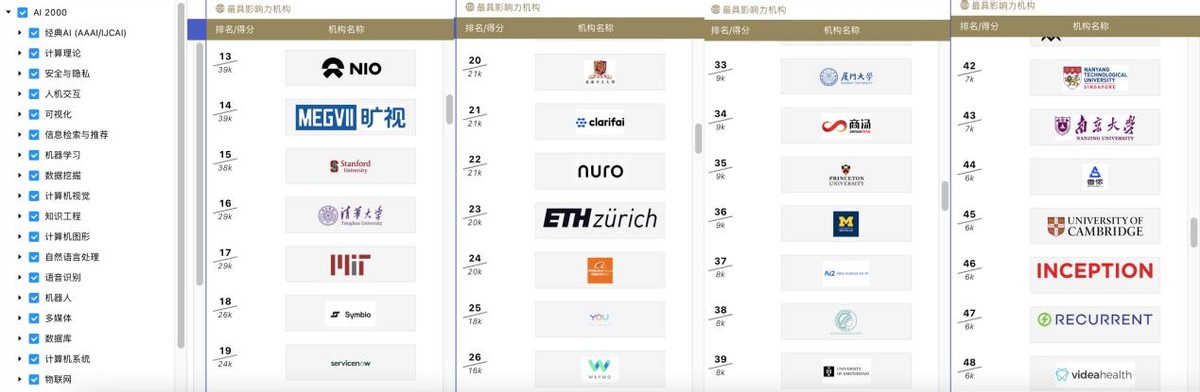 在全球最具影響力機構榜單的前五十名中,有9家中國機構,分別是第13位NIO、第14位曠視、第16位清華大學、第20位香港中文大學、第24位阿里巴巴、第33位廈門大學、第34位商湯、第43位南京大學以及第44位香儂科技。