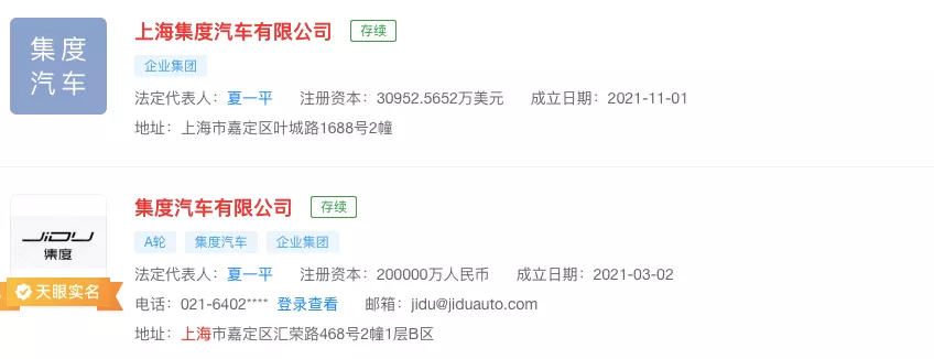 2021年3月,「集度汽車有限公司公司」在上海註冊成立,該公司註冊資本20億元,地址為上海市嘉定區;2021年11月1日,「上海集度汽車有限公司」設立,註冊資本3.1億美元,法定代表人夏一平,註冊地址為上海市嘉定區。