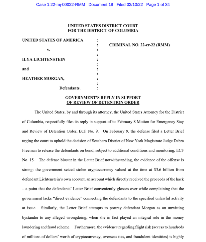 此前因涉嫌協助數十億美元被盜比特幣的洗錢犯罪,Heather“Razzlekhan”Morgan 與丈夫 Ilya“Dutch”Lichtenstein 雙雙被捕。上週,一名法官已准予其保釋,但遭到了政府的緊急叫停,理由是擔心這對夫婦可能攜款潛逃。