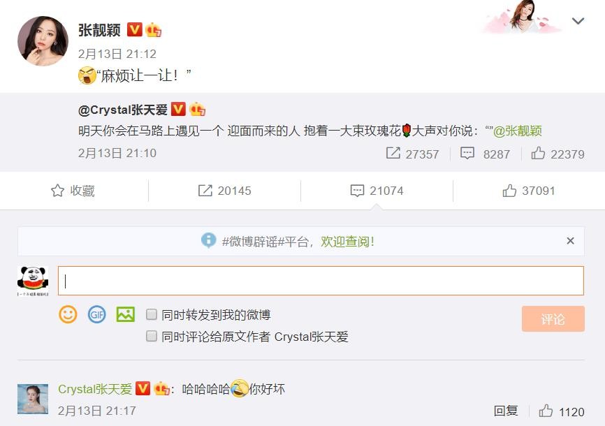 情人節前一天,張天愛就艾特張靚穎說,明天你會在馬路上遇見一個迎面而來的人,抱著一大束玫瑰花,大聲對你說:“……”,張靚穎隨後轉發說:麻煩讓一讓↓