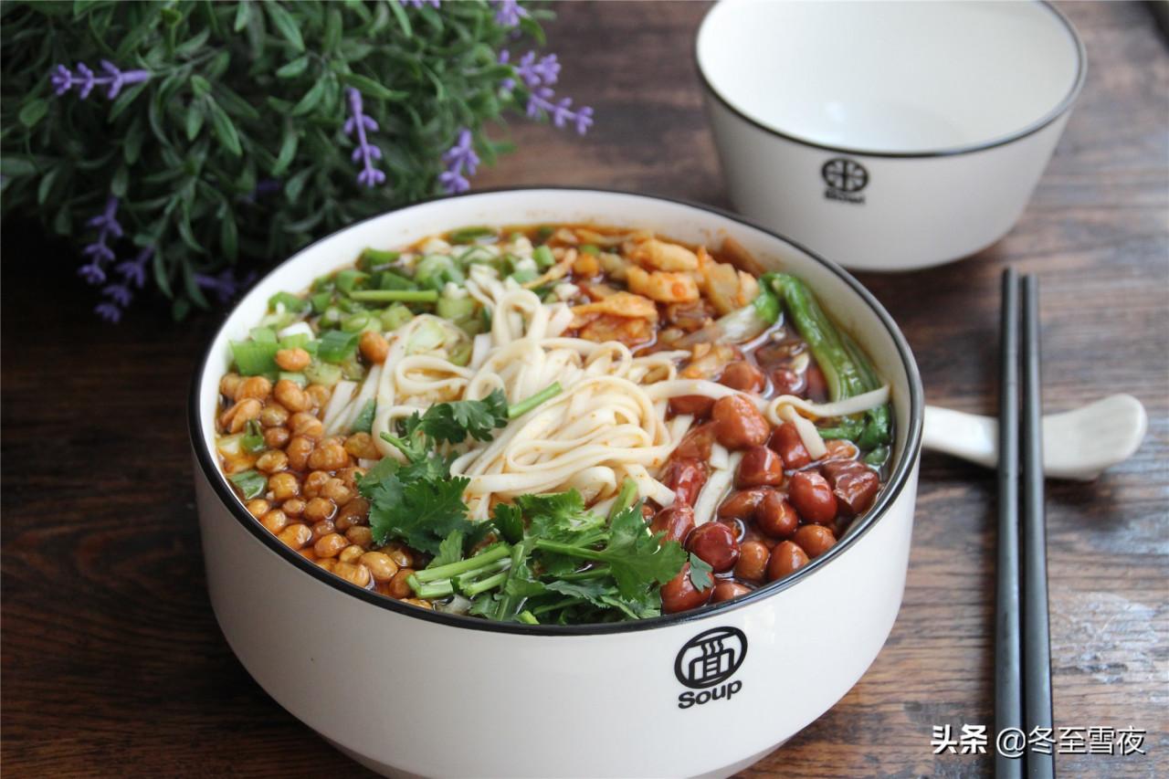 1.準備好所需材料,用的掛麵就是普通的掛麵,油酥花生米和黃豆,家裡有就放,沒有就不用放,用豌豆也可以。