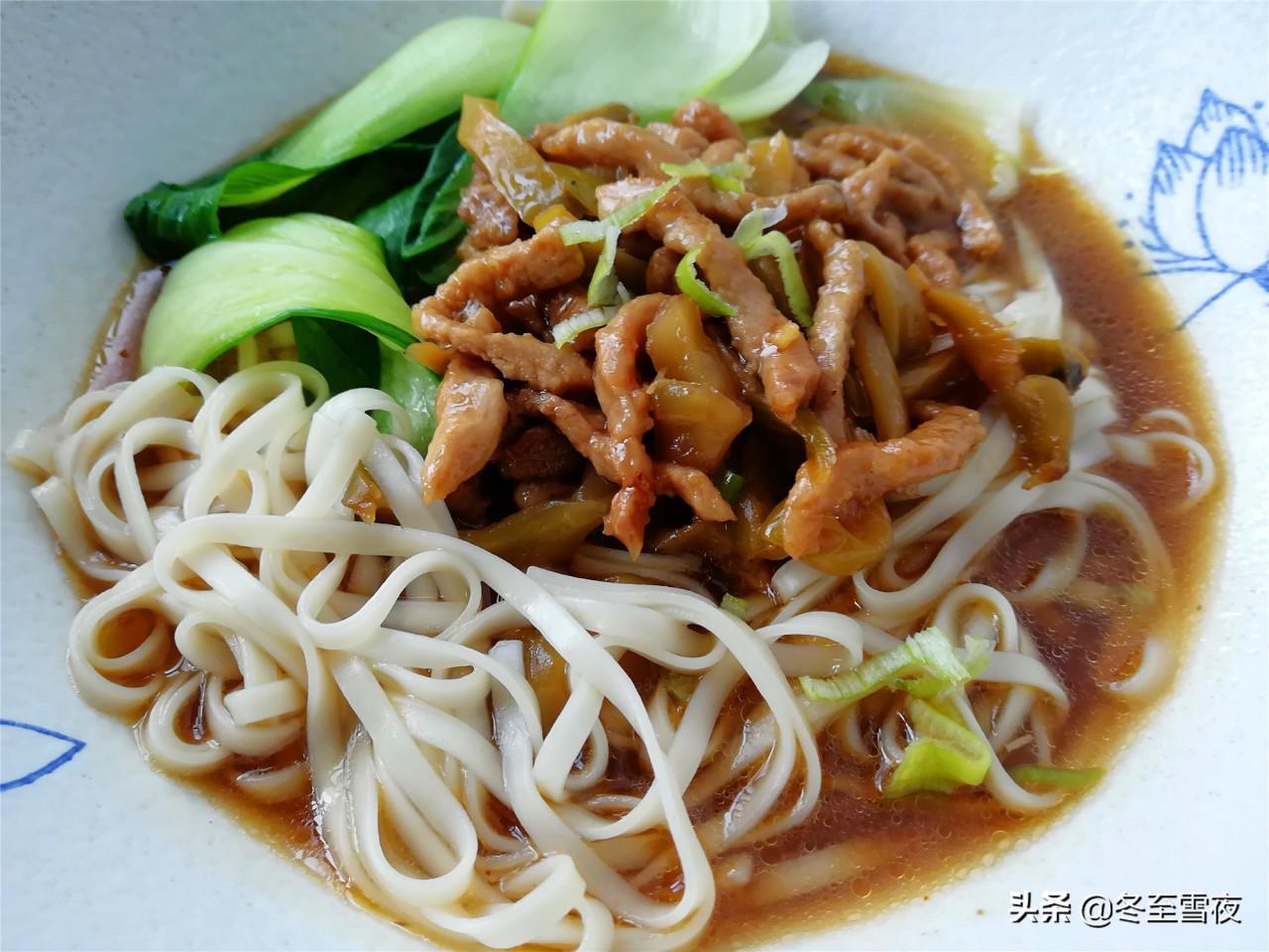 【榨菜肉絲湯麵】所需材料:掛麵150克、榨菜1袋、豬肉100克、油菜1棵、油鹽適量、蔥1段、姜1片、醬油1湯匙、白胡椒粉1茶匙、雞精半茶匙、