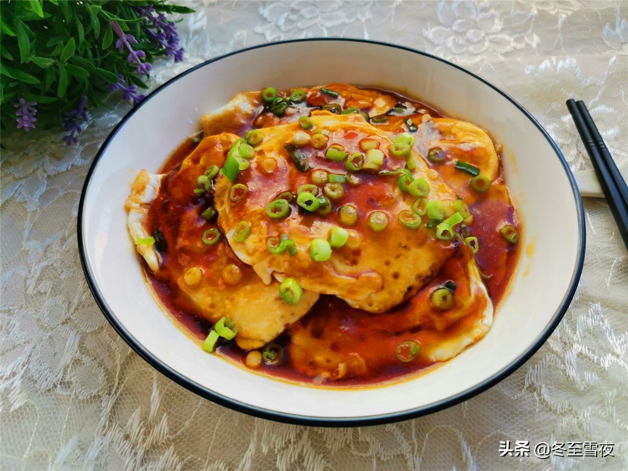 4.雞蛋煎好後,淋入調好的料汁,加熱至湯汁變得黏稠,把雞蛋翻面,均勻地裹上芡汁,撒上蔥花,關火,盛出裝盤即可。