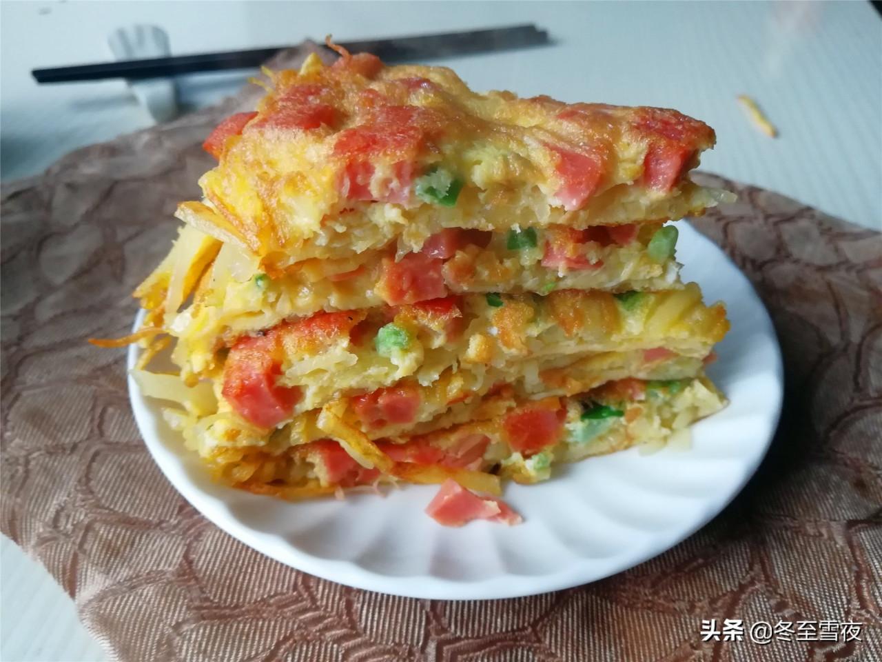 【土豆絲火腿蛋餅】 所需材料:土豆1/2個、雞蛋2個、火腿腸1根、小蔥1根、油鹽適量、