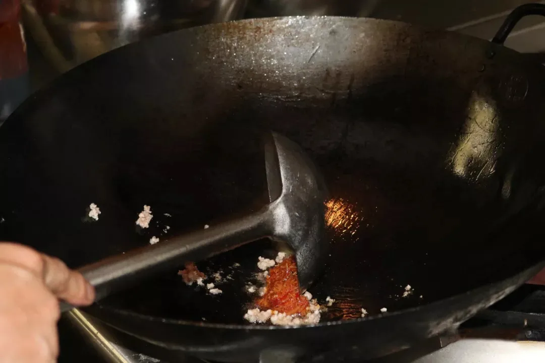 鍋內入牛油5幹克、菜子油2桶、色拉油2.5幹克燒熱,下郫縣豆瓣醬25幹克,大蒜6千克,老薑2.5千克,大蔥1.5千克,圓蔥、冰糖各1千克,花椒250克,酒糟3瓶,十三香15盒,二鍋頭875克,辣椒3.5千克,炒香炒勻。