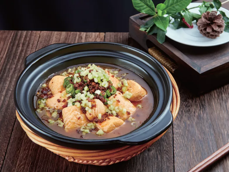 3.熱鍋冷油,下入五花肉末小火炒至色金黃,加入蒜泥與豆瓣醬炒香,烹入1炒勺鮮湯,倒入炸好的日本豆腐塊,加入鹽、生抽、老抽、雞粉,小火燴至豆腐入味後,轉大火勾芡,加入二荊條辣椒圈拌勻,起鍋裝入加熱好的煲仔中,撒上西芹粒即成。