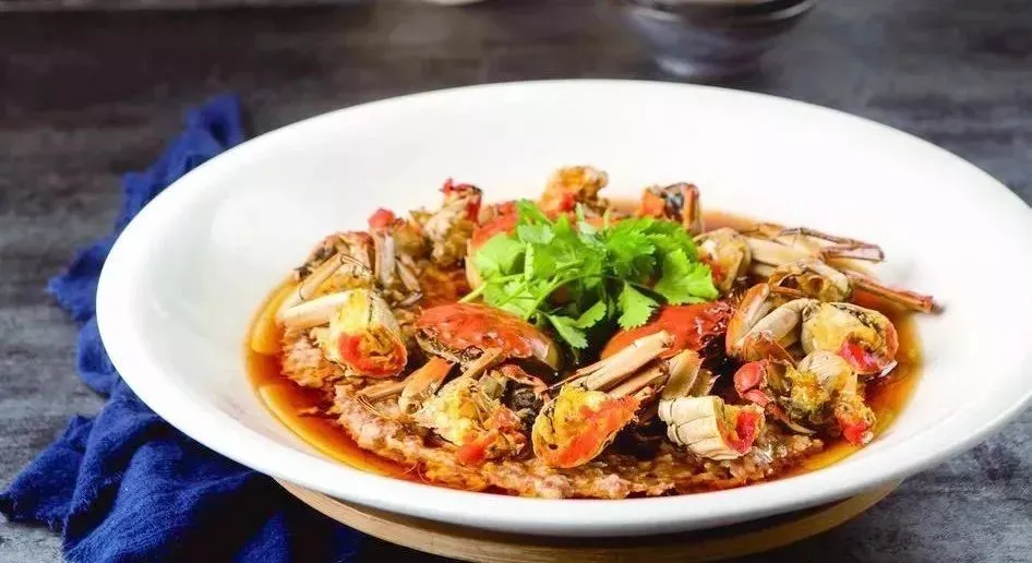 3.把肉蟹放在盤中肉餅上,上籠蒸半個小時,取出來,把蒸好的肉蟹改刀擺盤中,撒上香菜即成。