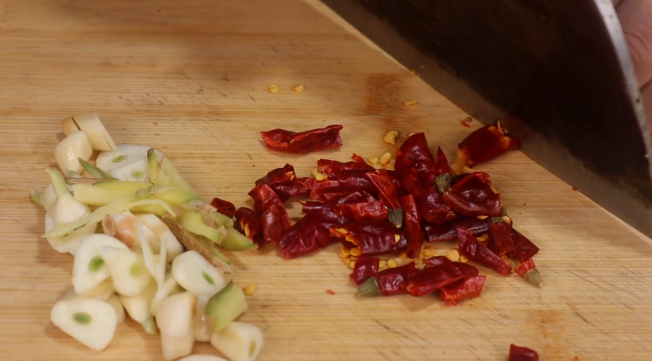 4、把準備好的大蒜取出來,去皮,然後切片,切完片之後咱們再來切一下生薑,生薑切成生薑絲就可以了。接下來咱們將幹辣椒切一下,把幹辣椒切成小段裝盤備用,然後放入花椒,接下來就可以起鍋燒水了。