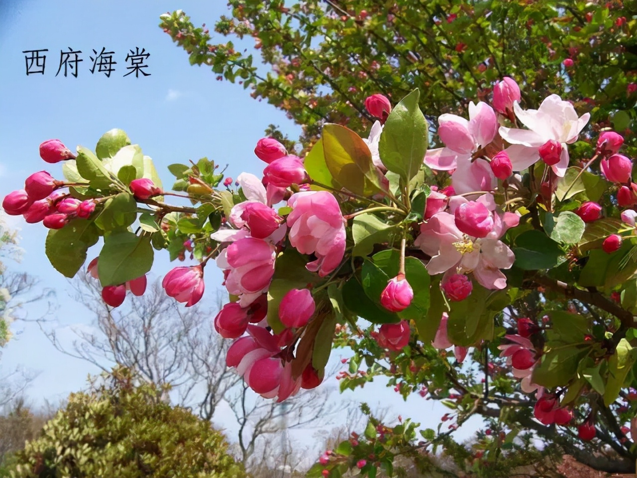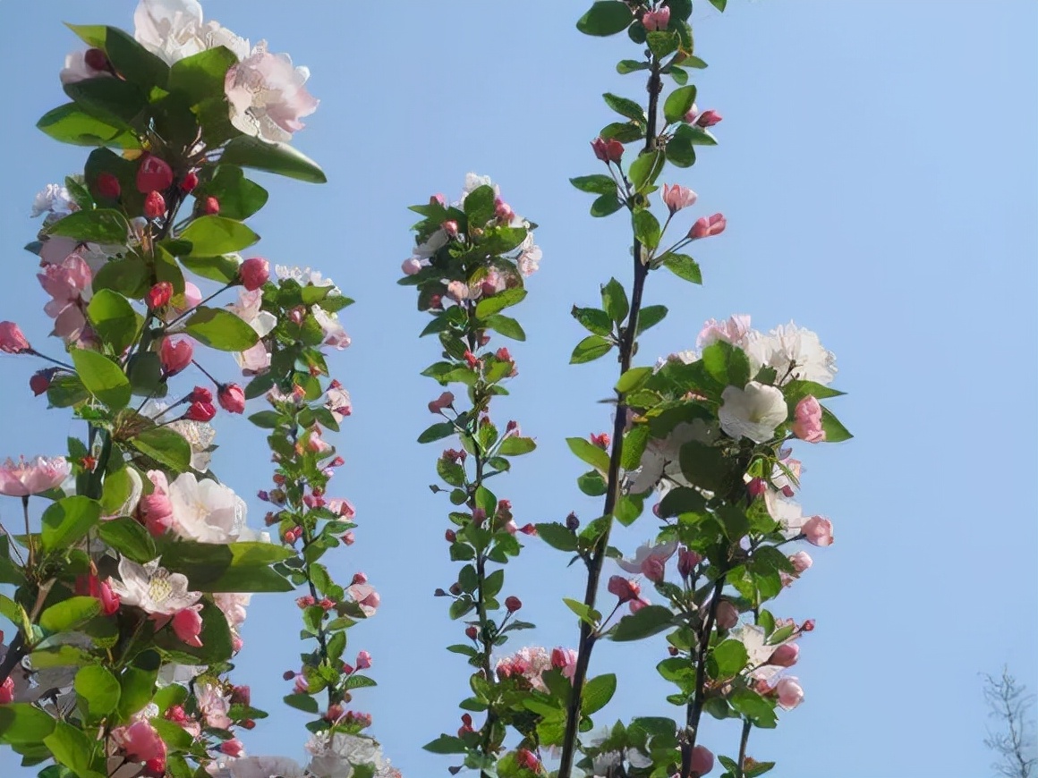 ⑤、西府海棠的花朵比較大,而且是成簇的開花,花朵朝上,整個的樹勢看上去都是向上收攏的,看上去非常的顯瘦。還有個特點就是,西府海棠的花有香味,雖然不濃郁,但是一股股的清香還是非常誘人的。