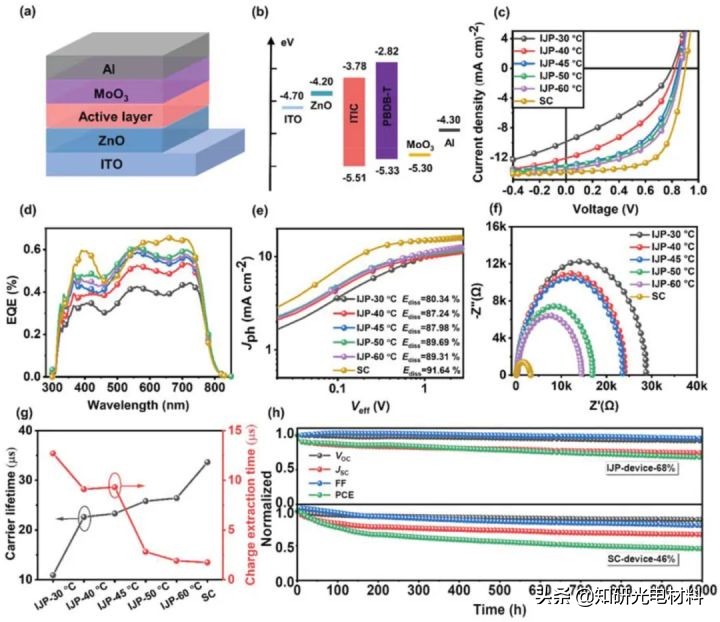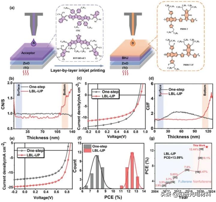 然而,印刷溫度的升高將導致從表面到底部形成均勻的垂直相分離,這不利於電荷收集。為了達到平衡,他們進一步開發了高溫下逐層噴墨列印的策略,直接將聚合物給體列印在受體表面的頂部。透過這種最佳化方法,可以獲得具有梯度垂直相分離和可接受分子聚集的平衡奈米相形態特徵。利用所開發出的新方法,最終制備的基於PBDB-T-2F:BTP-BO-4Cl器件效率達到創記錄的13.09%。