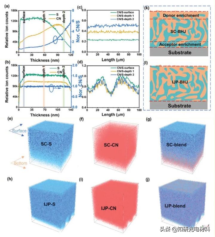 近日,中科院蘇州奈米所駱群副研究員團隊以噴墨列印活性層製備高效OSCs為目標,對共混膜的奈米相形貌進行了系統的研究和控制。研究人員透過最佳化襯底溫度和液滴間距,獲得了均勻的薄膜,並基於GIWAXS、AFM和ToF-SIMS結果,研究了噴墨列印薄膜的介觀和奈米相形態。研究結果顯示,提高印刷溫度能夠有效地抑制過量聚集,改善晶體結構,從而導致激子解離增強。