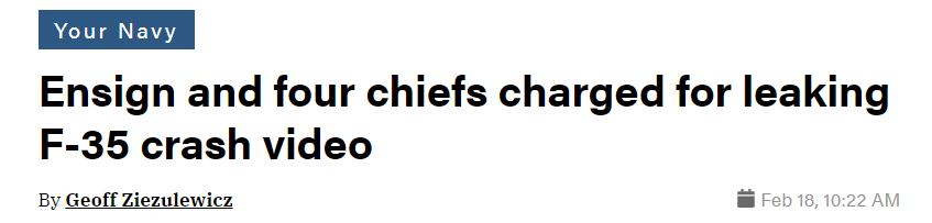 據美國《海軍時報》2月18日報道,因洩露F-35C在“卡爾·文森”上著艦失敗的艦上攝像機影片,一名軍官與四名高階士官將面臨“非司法懲處”。