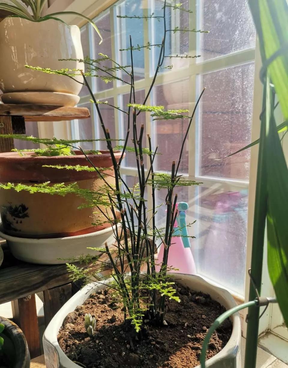 而文竹最容易出現的幾種問題就是葉子發黃或不發新芽長得慢,這時候可以把文竹發黃的葉片全部剪掉,千萬不要捨不得,齊根剪,白放在明亮散光的地方,雖然剛開始光禿禿的,但不出一個月就可以冒出更多新的葉片,看起來更清新別緻,舊貌換新顏。