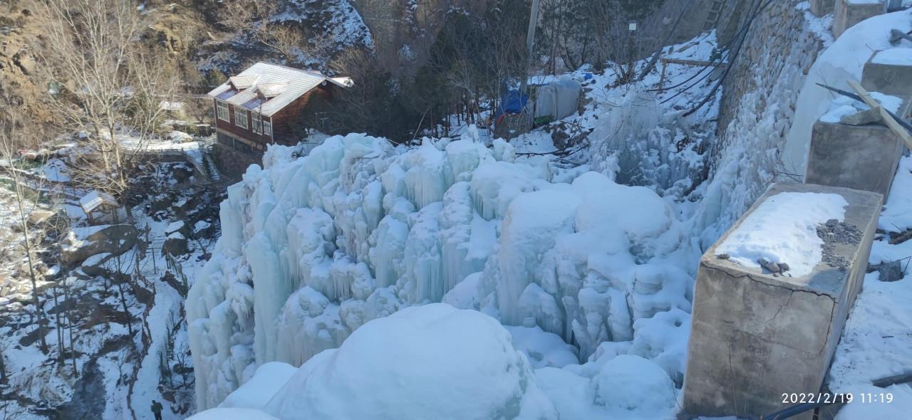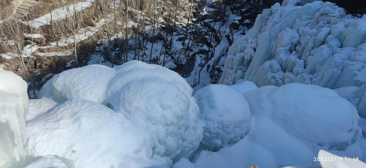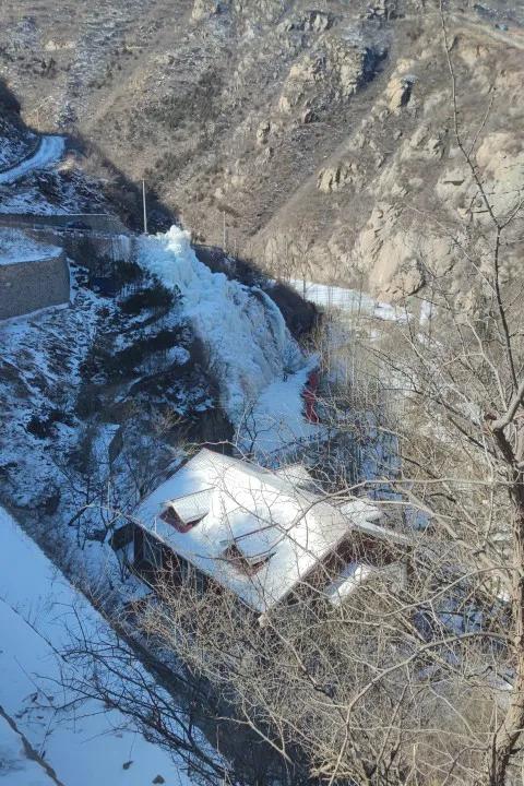 從山路上居高下望,山澗裡的景緻一覽無餘。山溪水的冰面上全是雪,還有一個個的冰瀑。