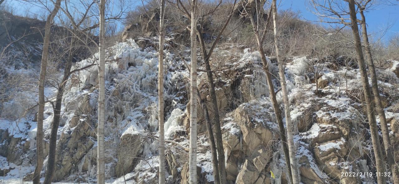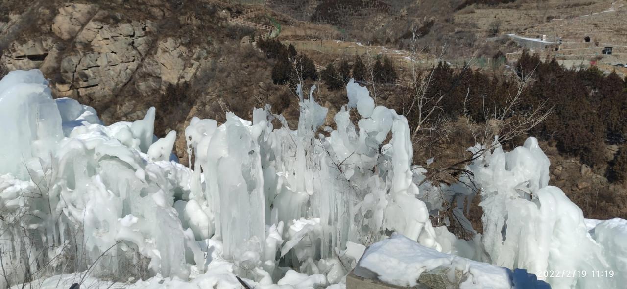 這是澗溪和山路間幾顆樹木為依託凍成的冰樹。在山路上看不到它下部,等會兒在澗裡會看到它下部的壯觀冰瀑。