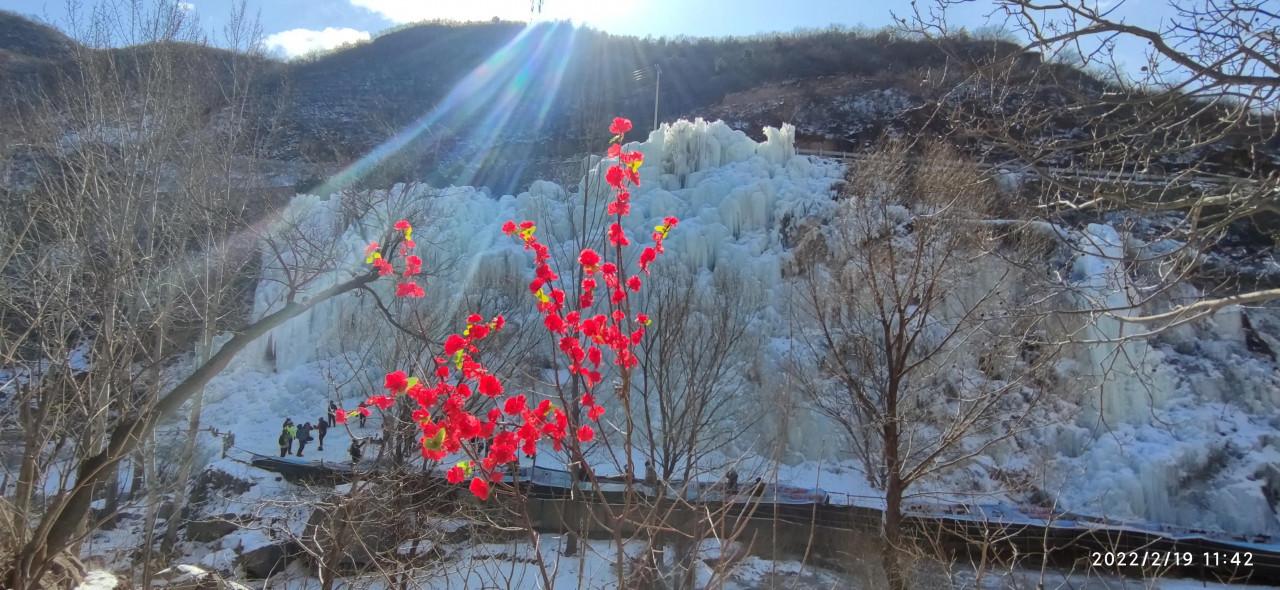 這應該是這裡最大最壯觀的冰瀑。近處人工紅花,紅花左上拍到的是逆向陽光投射下的幾束光瀑。