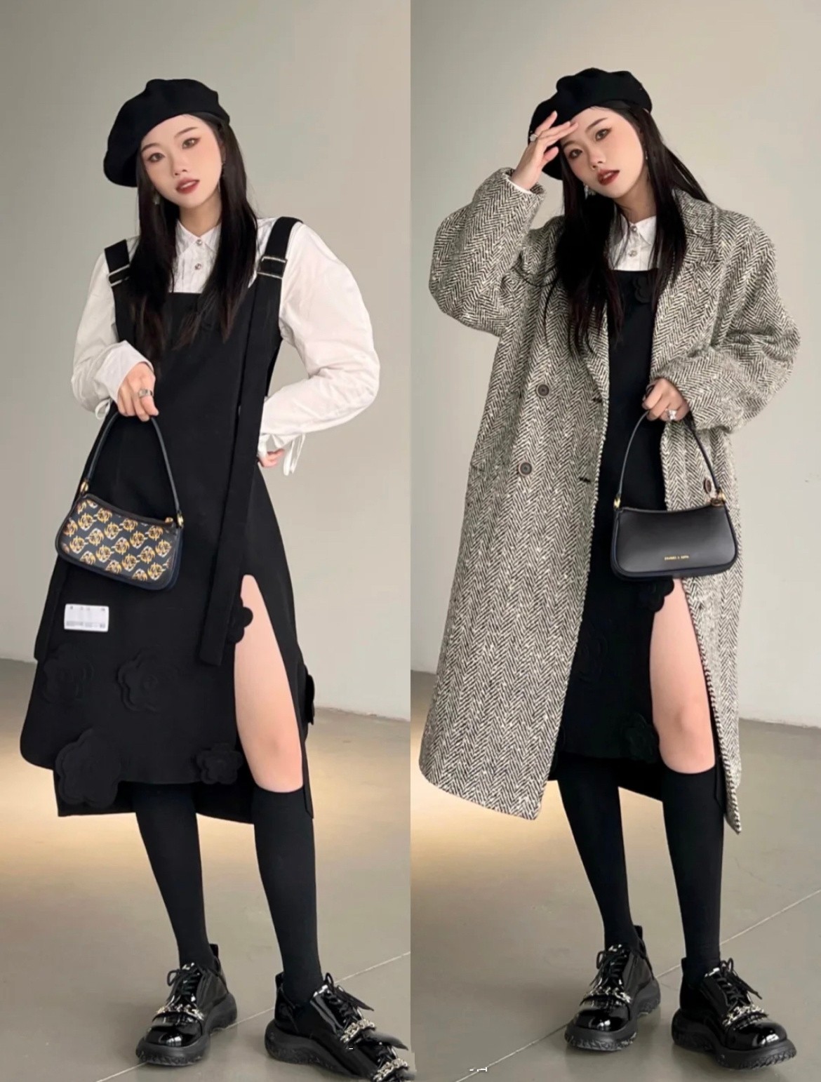 如果你擔心款式設計上太過於個性化的話會很容易增加駕馭難度,從而在穿搭的時候容易撐不起來的話,可以嘗試偏向精緻的個性化設計,比如模特身上這款黑色的連衣裙看上去沒有什麼個性的地方,但是在高開叉的裙襬設計上卻使用凸出來的小花朵元素來裝點,巧妙的避開了寡淡感。