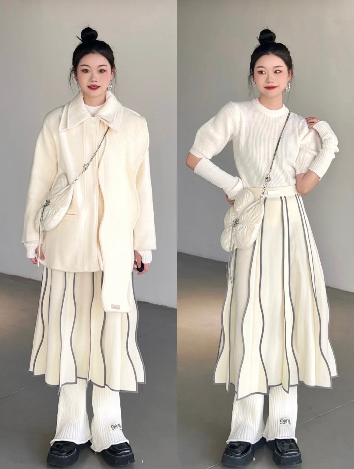 基礎簡單又非常清爽的一身白色衣服穿起來沒有太多的亮點,但是在款式的設計上卻個性十足,上半身的外套在衣襟的部分使用長短不一的設計方式來呈現出參差感,下半身搭配個性化的百褶半身裙又可以穿出一種波浪紋的感覺。