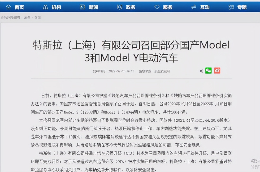 本次召回的訊息,是在2月18日被相關部門公示後,今天才在網上爆出的。特拉斯在國內被召回2.6W輛電動汽車,主要原因是:問題部分車輛的熱泵電子膨脹閥定位時會有微小移動,因軟體(2021.44至2021.44.30.6版本)沒有糾正功能,長期可能造成閥門部分開啟,熱泵壓縮機停止工作,車內製熱功能失效。
