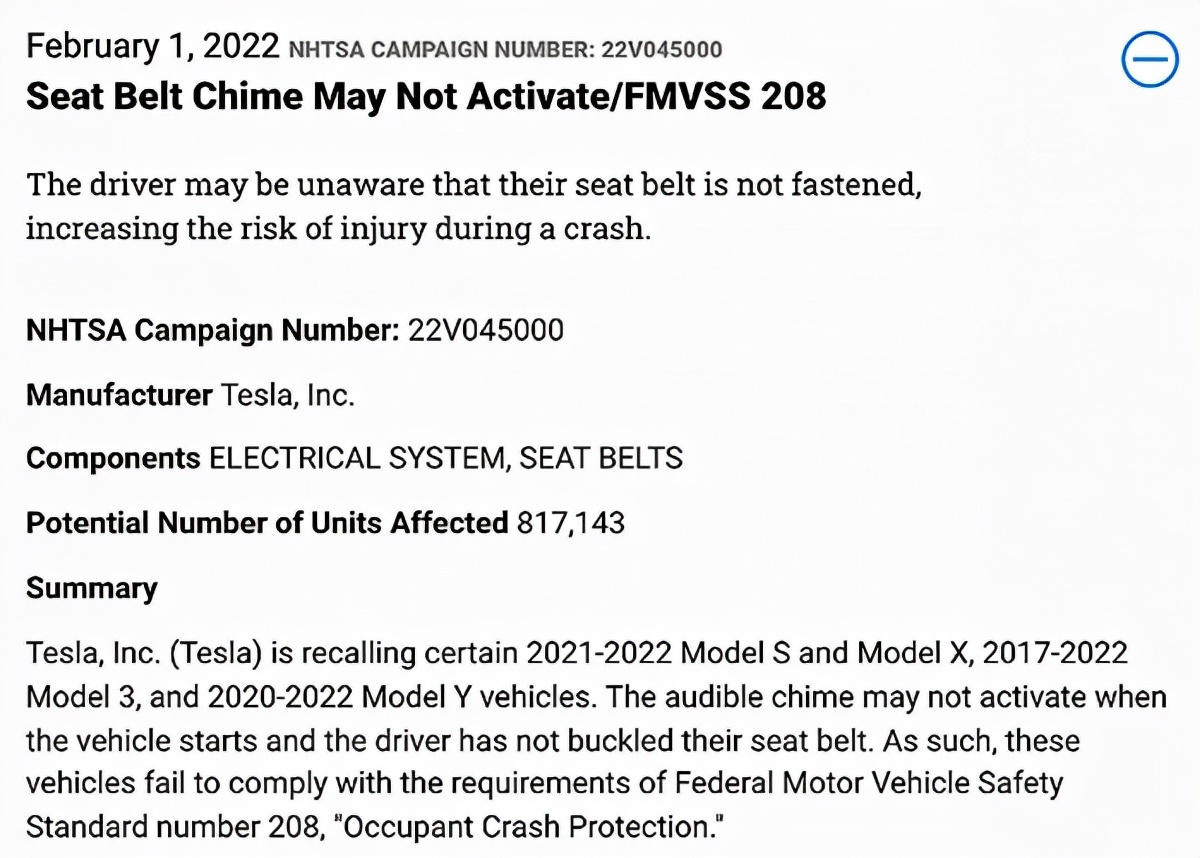 3、2月3日召回超過81.7萬輛汽車,因為相關批次車輛安全帶提示(沒扣安全帶時,蜂鳴器沒有安全提醒聲)存在問題;