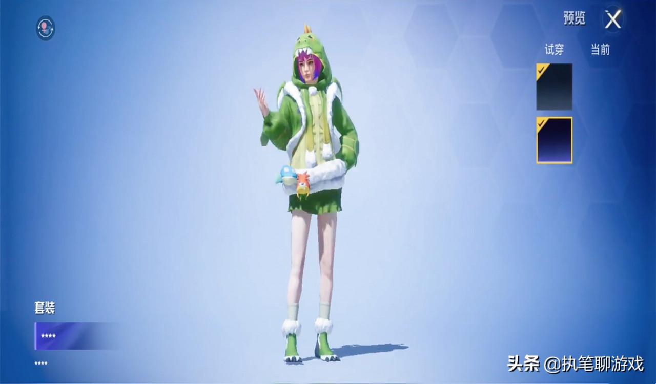 首先我們來說一下這套名叫“恐龍拽拽”的衣服,是不是覺得有些眼熟呢?此前在《和平精英》中有一套名叫“恐龍睡衣”的套裝,而這套衣服同樣也是綠色恐龍的元素設計,但是比起“睡衣”的版型設計而言,明顯更好看一些。