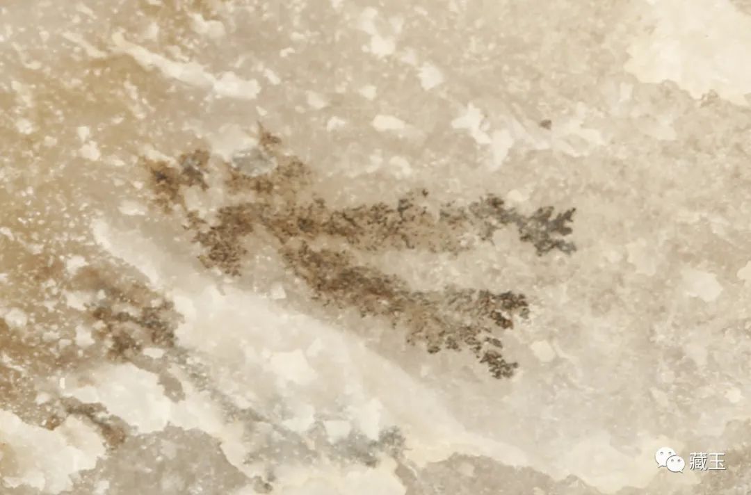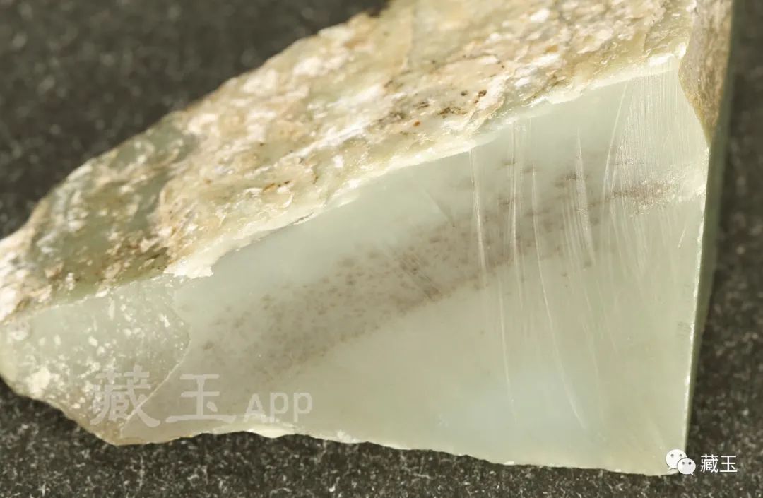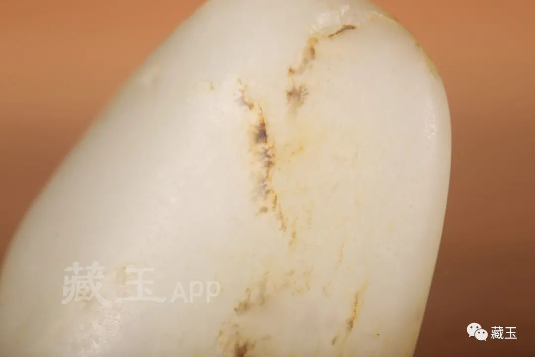 我們看它的水草沁,唐河料因為也在河床裡沖刷過,所以也會有水草沁的出現,但它的水草沁可以看到有明顯的不同。