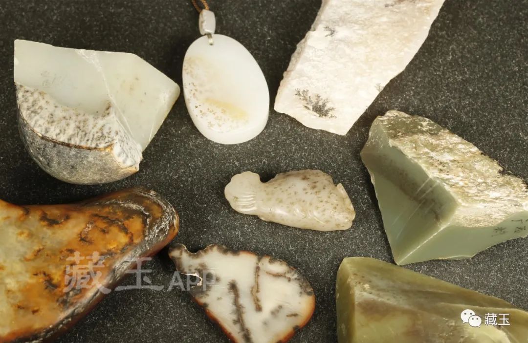 我們嘗試找了一些水草沁的標本,從這些標本中來尋找不同玉種“水草沁”的區別。