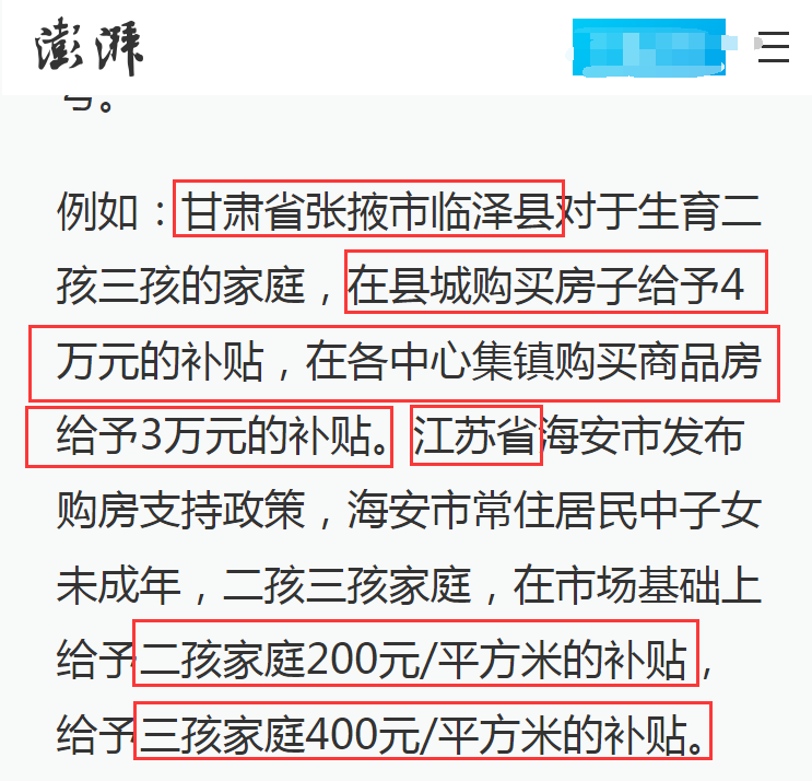 其中,甘肅省張掖市臨澤縣對於生育二孩三孩的家庭,在縣城購買房子給予4萬元的補貼,在各中心集鎮購買商品房給予3萬元的補貼。江蘇省的部分地區則是按立方米給補貼。另外,還有一些地區提高了公積金的貸款額度。