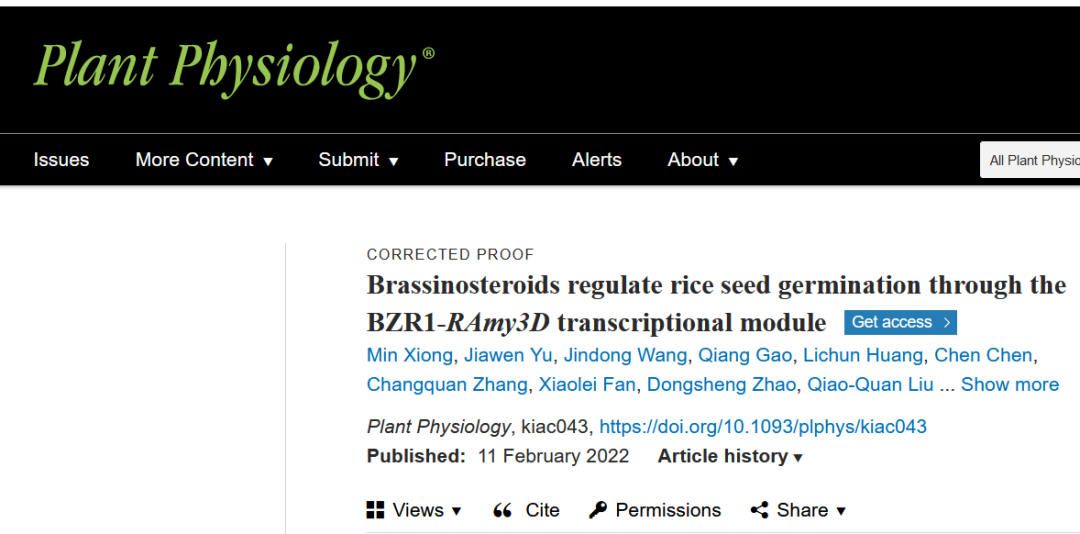 2月9日,揚州大學劉巧泉團隊在國際知名植物學期刊Plant Physiology線上發表了題為“Brassinosteroids regulate rice seed germination through the BZR1-RAmy3D transcriptional module”的研究論文,該成果揭示了BR透過核心轉錄因子BZR1調節水稻種子萌發的分子機制。