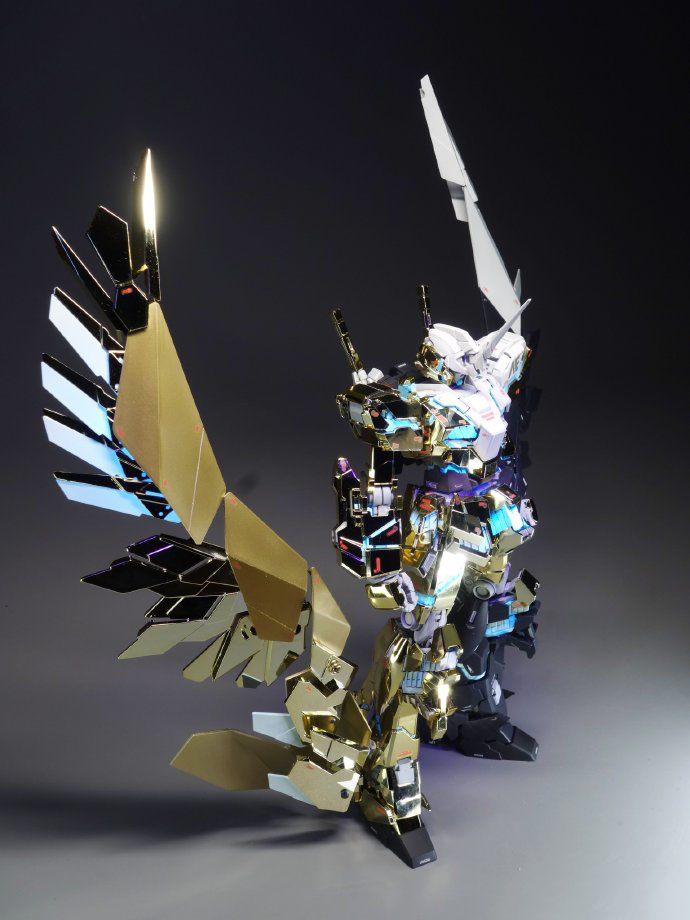 這款模改的獨角獸高達除了配色帥氣外,最有亮點的還是翅膀的造型,同樣配色是三款獨角獸高達配色拼接。翅膀的連線處是在腳部,那麼它飛行是用腳部帶動翅膀飛行嗎?腦袋裡突然閃現出了比較搞笑的畫面!