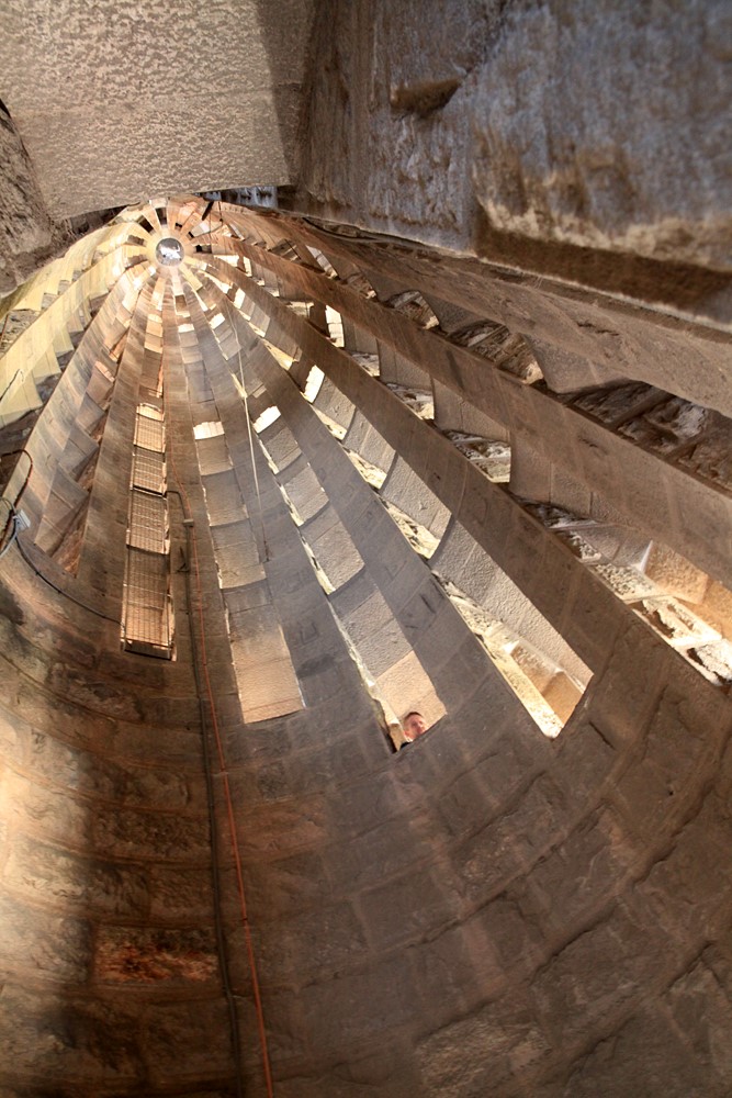 子彈頭一樣的圓頭尖拱是另一個招牌特色,這是倒置的懸垂線,據說受力特別合理。因為形狀獨特,這稱為加泰羅尼亞拱。這是高迪發明的