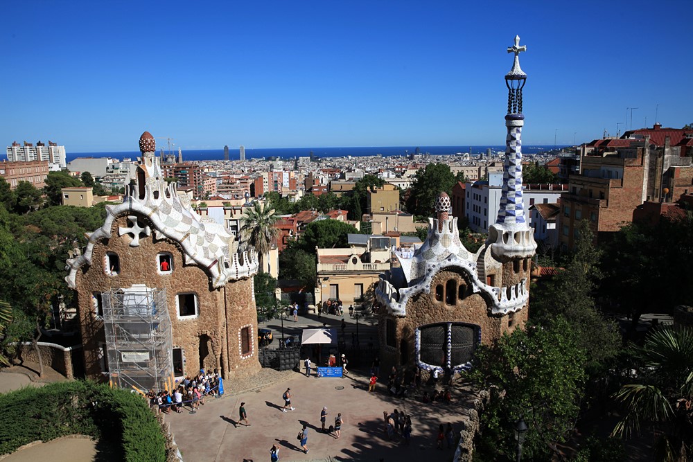 這裡其實是高檔居住小區,這是兩個門衛小屋,也是高迪設計的。遠處是地中海。這個地方原來是準備成片開發的,規定豪宅之間要留出足夠的綠地,但最後只有兩家入住,公共的花園部分反而成了經典。現在統統保護起來了,即使有壕們想進來造房子也不可能了