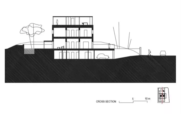 在上層,平面的四個角落皆為臥室,其中包含了三間一模一樣、帶有套間浴室的臥室,以及一間帶有更衣室的較大臥室。建築內部還容納了車庫、倉儲和服務區等空間。“圓廳”之家位於陡峭的山坡之上,它就如同一個嵌在自然之中的混凝土塊,與周邊有著相似顏色的石頭一同靜靜地屹立於山林之間。
