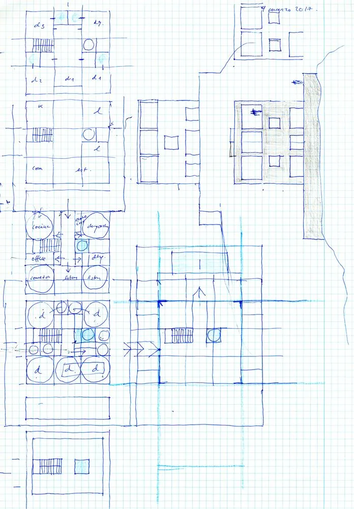 寬敞的起居室位於朝南的一側,其外側有著輕質的遮簷,藤蔓和茉莉花可以順著框架向上攀爬生長。平面中的幾何從室內延伸至場地邊緣的游泳池。此外,主入口設立在建築的北側,入口旁邊則是大廚房和餐廳。而在這一層的中心,有著一個4米x4米的方形交通空間,其中則囊括了電梯和樓梯等垂直交通方式。
